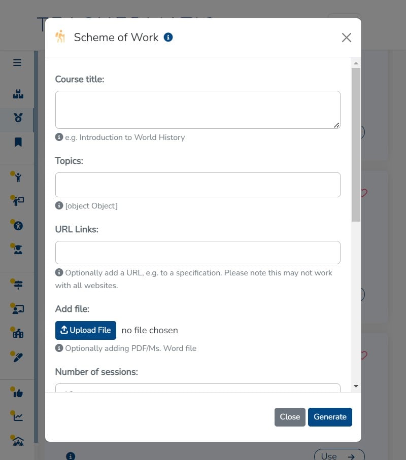 Planning a course is one of the most time-consuming preparation tasks, so this generator (which we also call the Course Planner) may become your go-to tool before the start of a term or a semester or a series of training sessions. It should take on a lot of the spade work and leave you to concentrate on your teaching rather than your planning. Keywords: Scheme; Plan; Sessions; Lessons; Year; Term; Semester; Pattern; Course;