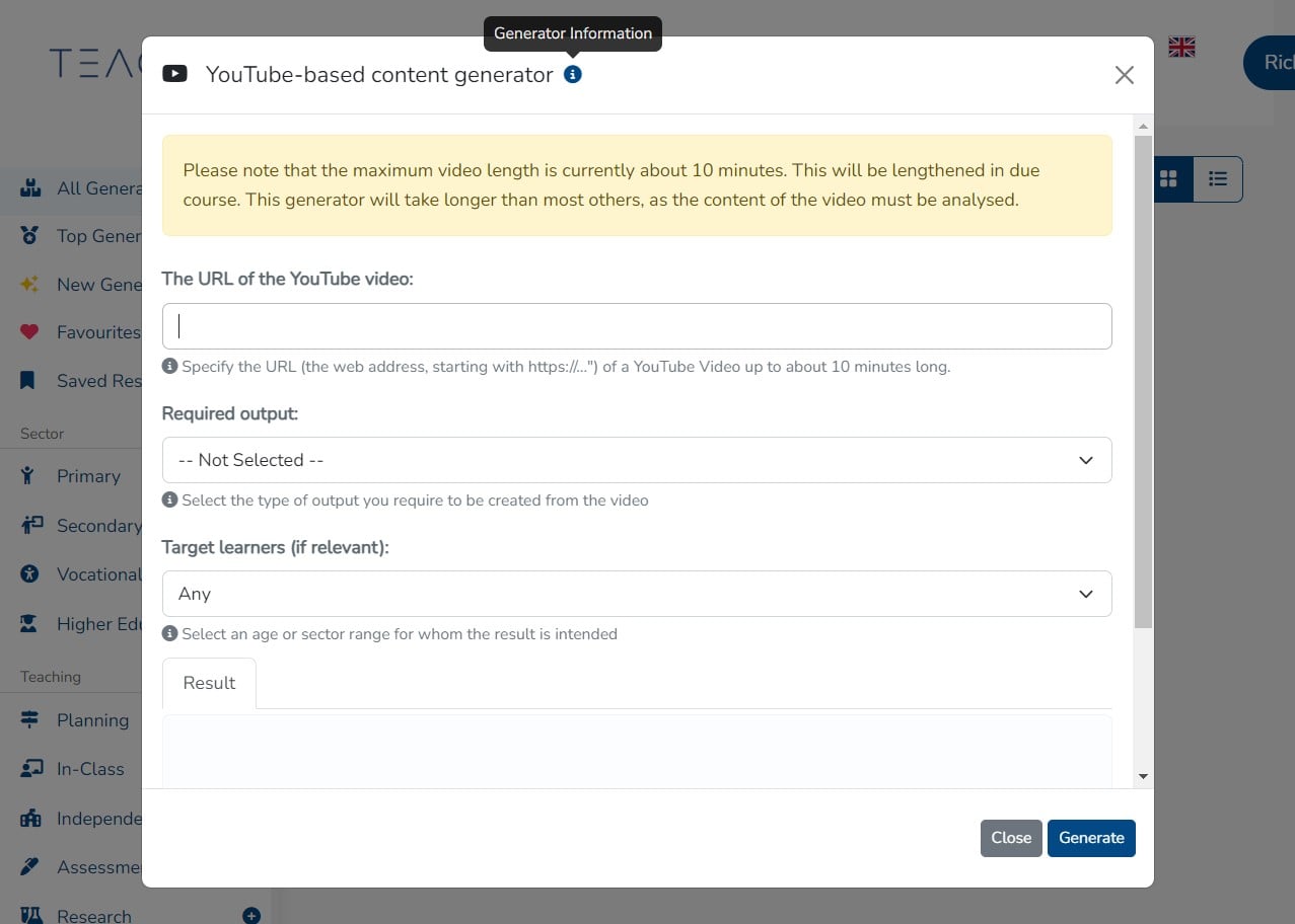 This generator takes the content of a YouTube video and uses it as the basis for a lesson plan or for a number of potential classroom (or independent) study tools. Using the result of this generator, you can get the learners to watch the video - giving them specific points to watch out for if you wish - and then present them with a quiz or some practical projects. Note that some videos do not allow this process but this is rare. Keywords: YouTube; Video; Transcript; View; Watch; Movie; Animation