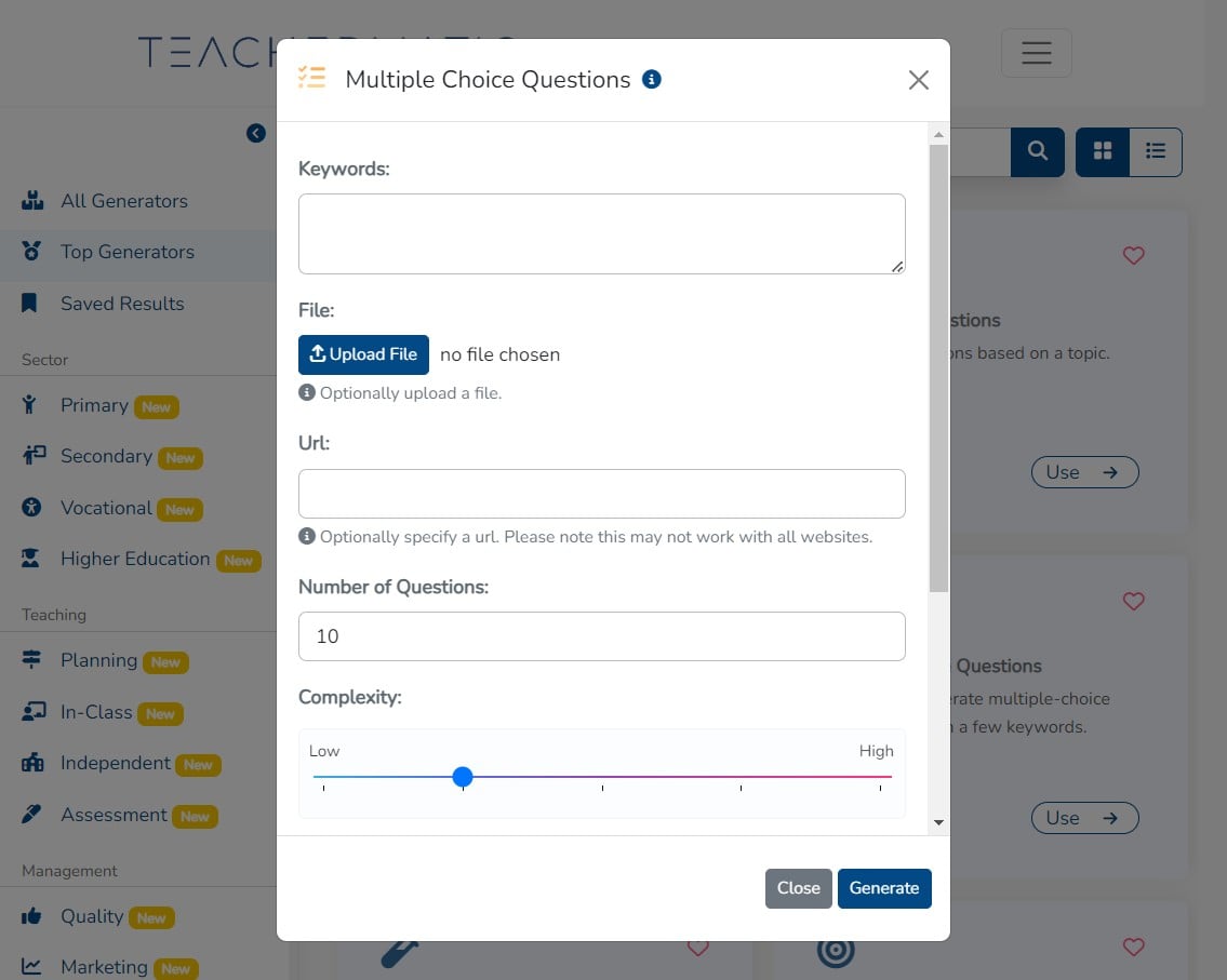 This is a very popular generator. There is plenty of scope for giving TeacherMatic the guidance it needs to provide you a choice of useful multiple choice questions (and answers!) by entering some keywords and, if you wish, pointing to a particularly relevant website and/or to uploading a favourite document of your own. Keywords: Questions; Quiz; Test; Assess; Learning; MCQ; Answers;