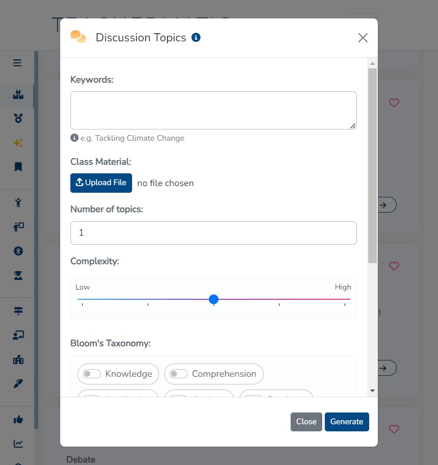 Discussing a topic with the whole class, or breaking into groups for a discussion, can be useful way both to reinforce learning and measure depth of understanding. This generator will suggest topics for discussion based on one or more keywords or phrases, or on a document (such as a handout) which you upload. Keywprds: Discussion; Debate; Talk; Argue; Propound; Group; Assess;